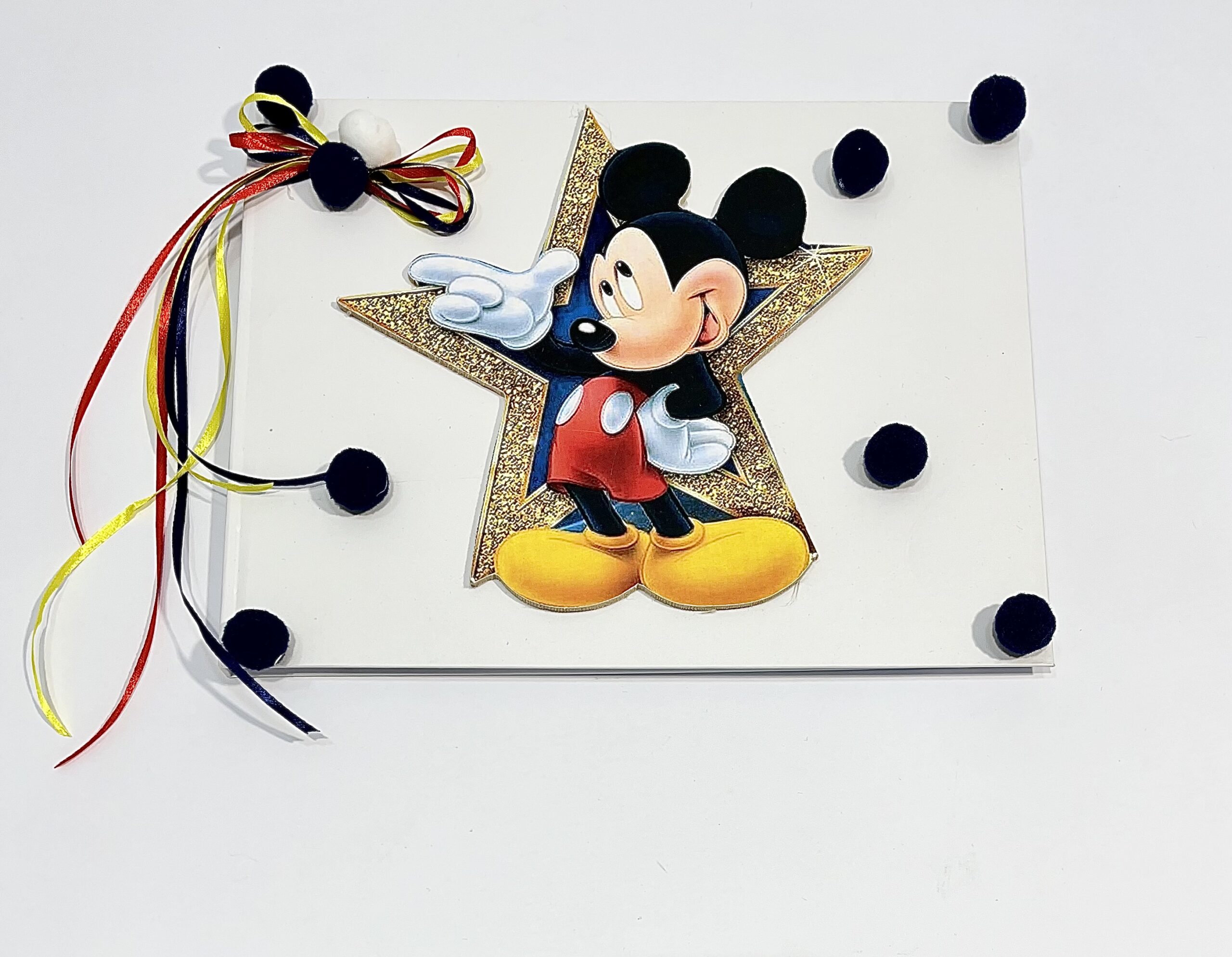 Χειροποίητο βιβλίο ευχών για αγόρι με θέμα Μίκυ Μάους, λευκά και μπλε πον πον και φιόγκο από κόκκινη κίτρινη και μπλε κορδέλα.
