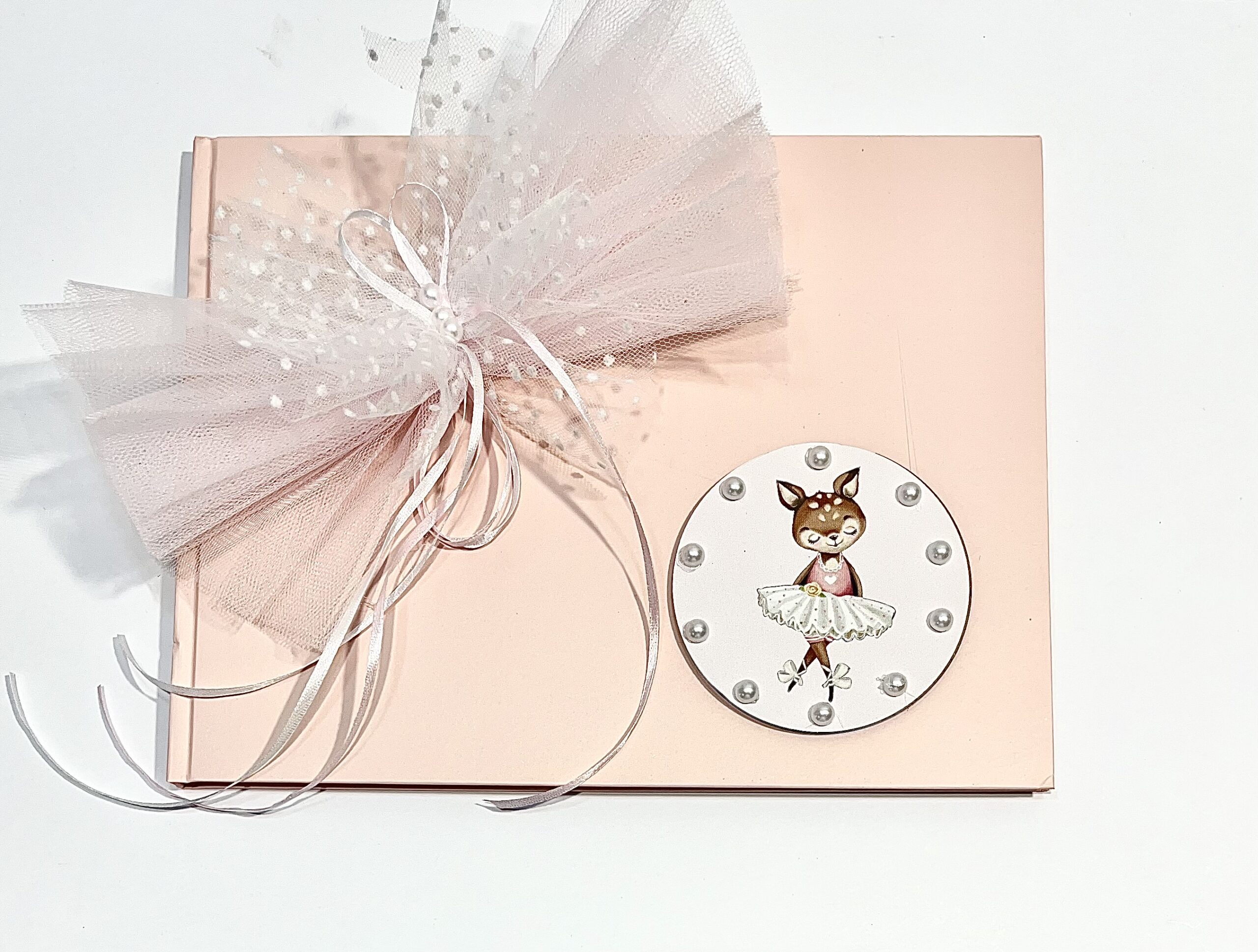 Χειροποίητο ροζ βιβλίο ευχών για κορίτσι με θέμα ελαφάκι μπαλαρίνα. Με ροζ και πουά τούλι, λευκή και ροζ κορδέλα και διακοσμητικές πέρλες.