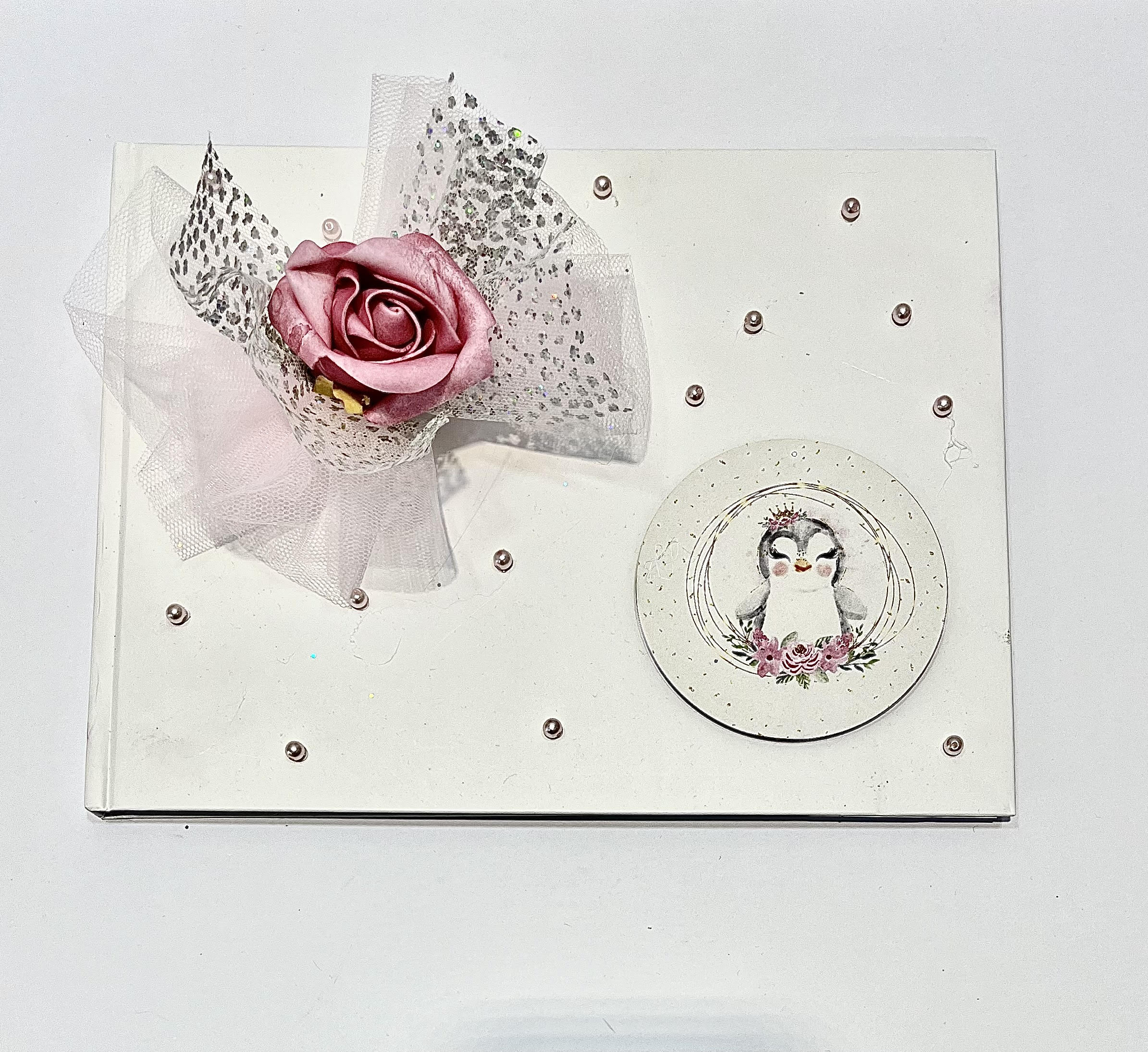Χειροποίητο βιβλίο ευχών για κορίτσι με θέμα πιγκουίνο, τούλινο ροζ φιόγκο με γκλίτερ, πέρλες και διακοσμητικό τριαντάφυλλο.