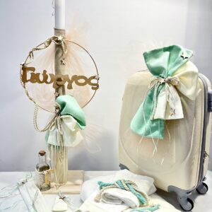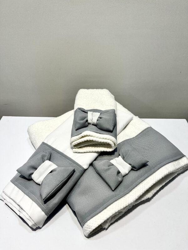 Χειροποίητο σετ λαδόπανα για αγόρι, με γκρι φάσα και διακοσμητικό γκρι φιόγκο.