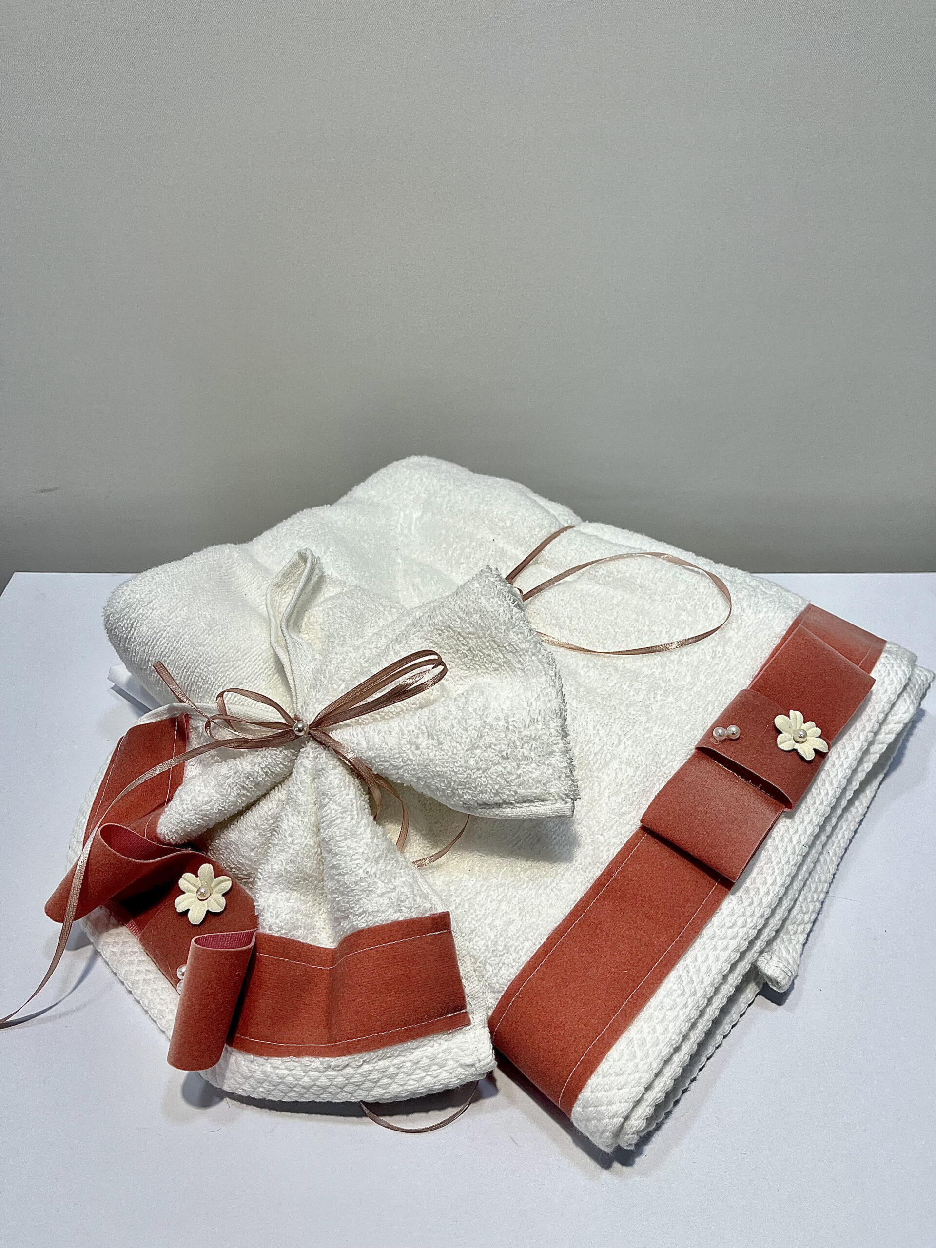 Χειροποίητο σετ με λαδόπανα για κορίτσι, με βελούδινη φάσα σάπιο μήλο και διακοσμητική λευκή μαργαρίτα.