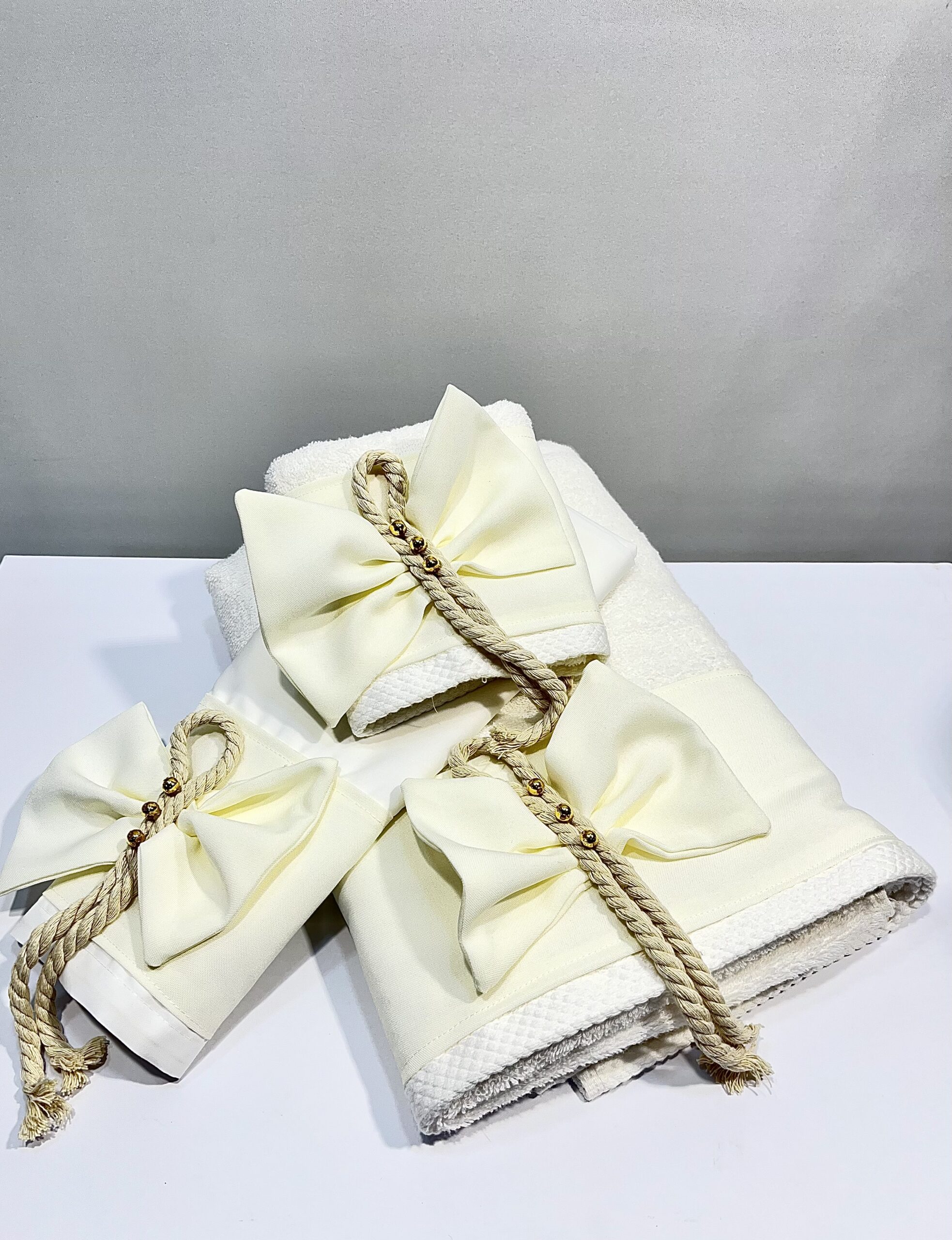 Χειροποίητο σετ με λαδόπανα για κορίτσι, με εκρού φάσα, εκρού φιόγκο, καραβόσχοινο και χρυσές μπίλιες.