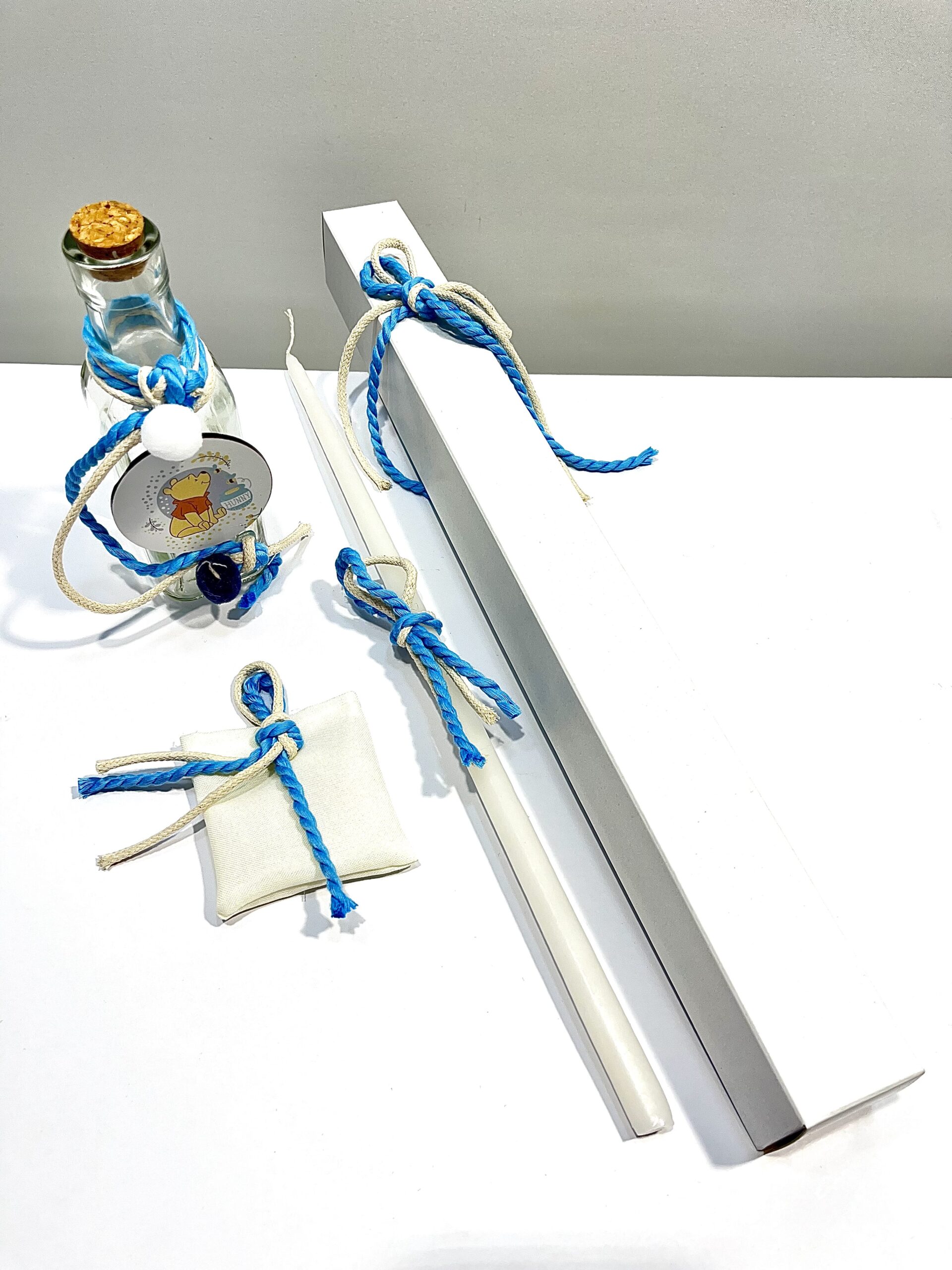 Χειροποίητο λαδοσέτ για αγόρι με θέμα Γουίνι, με γαλάζιο καραβόσχοινο, εκρού σχοινί, λευκό πον πον και μπλε χάντρα.