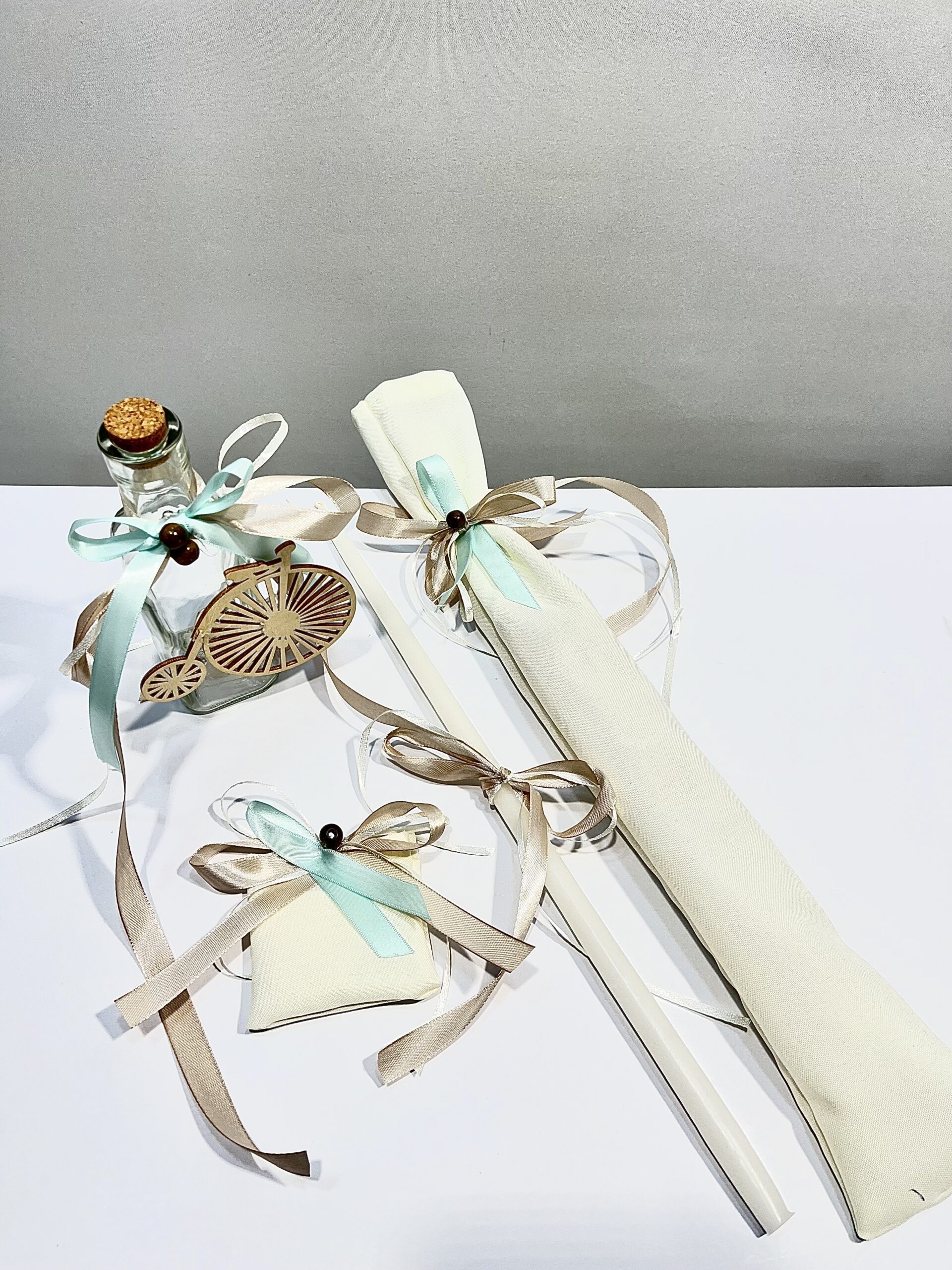 Χειροποίητο λαδοσέτ για αγόρι με θέμα ποδήλατο, με εκρού και βεραμάν κορδέλα και καφέ χάντρα.