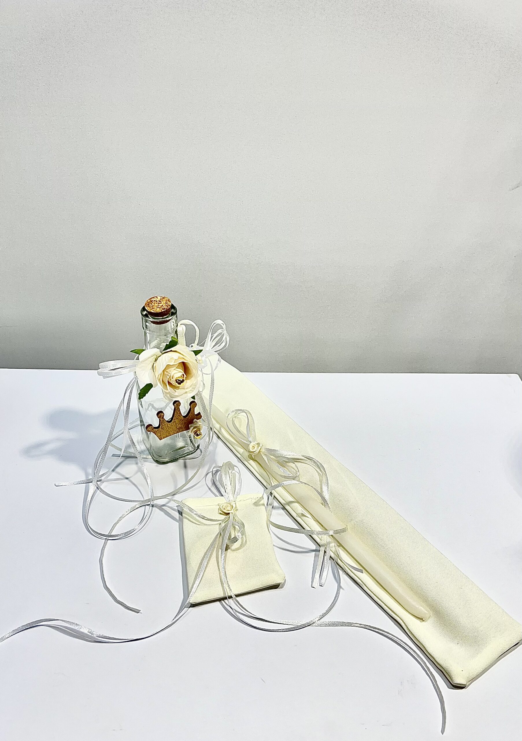 Χειροποίητο λαδοσέτ για κορίτσι με θέμα κορώνα, λευκό λουλούδι και διακοσμητικά τριανταφυλλάκια.
