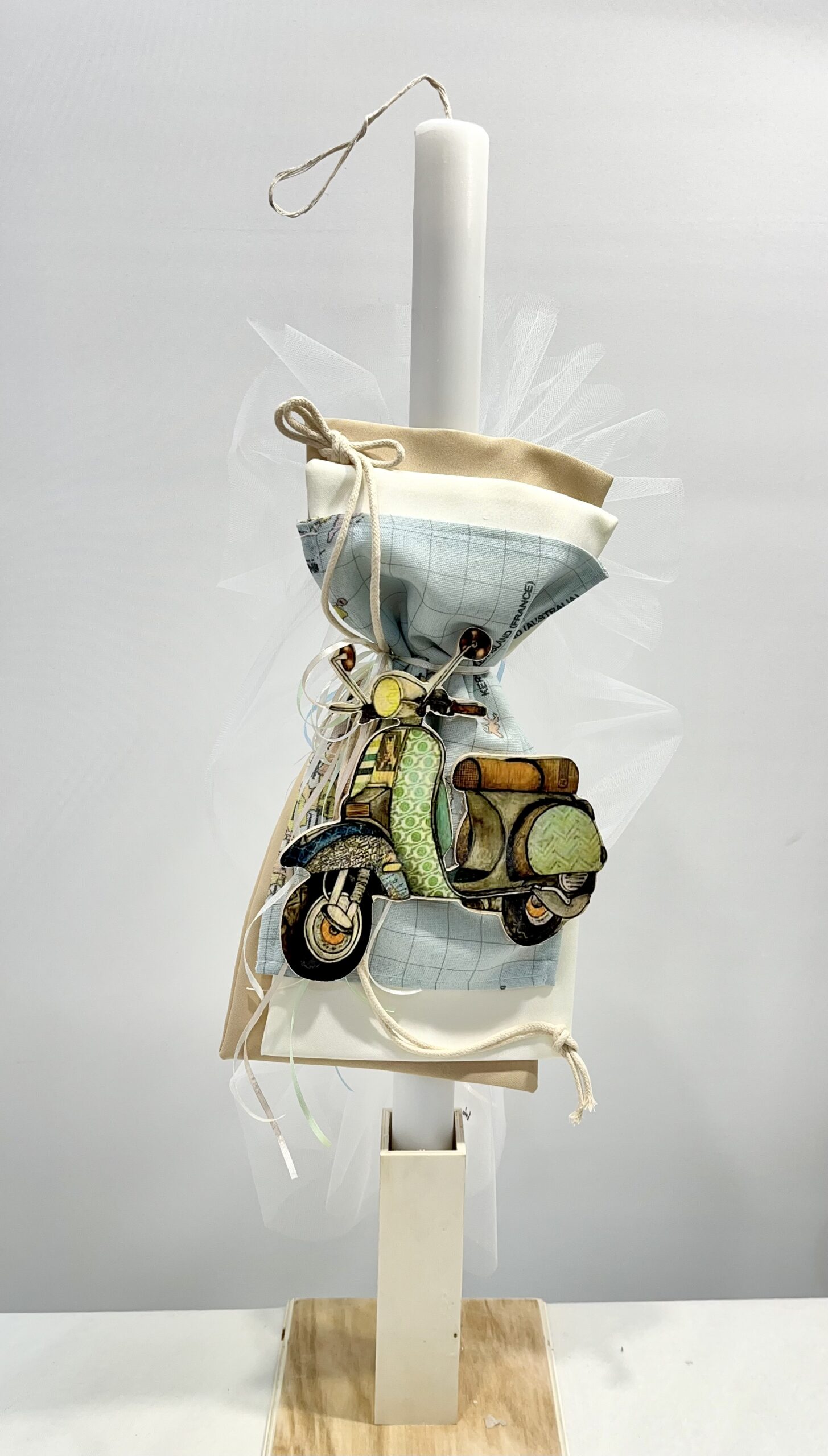 Χειροποίητη λαμπάδα και μπρανς για αγόρι, με θέμα βέσπα. Με λευκό τούλι, μπεζ, εκρού πανί, πανί με σχέδιο χάρτη και εκρού σχοινί.