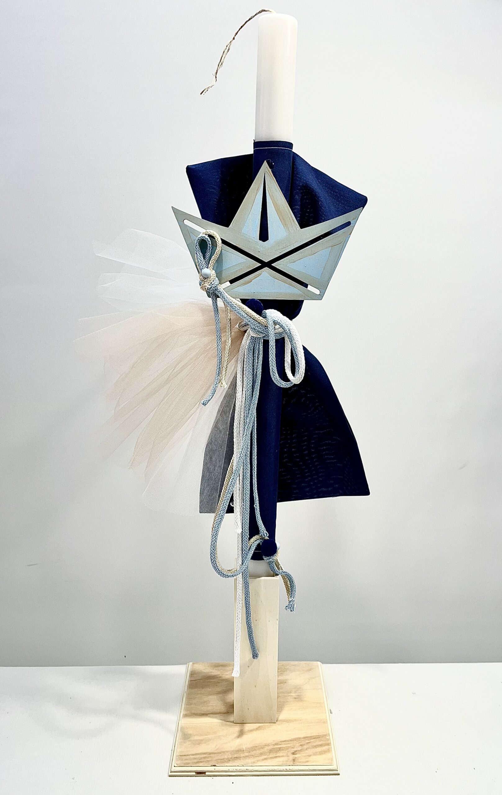 Χειροποίητη λαμπάδα και μπρανς για αγόρι, με θέμα καραβάκι. Με μπλε πανί, λευκό και γαλάζιο καραβόσχοινο και διακοσμητικό καραβάκι.
