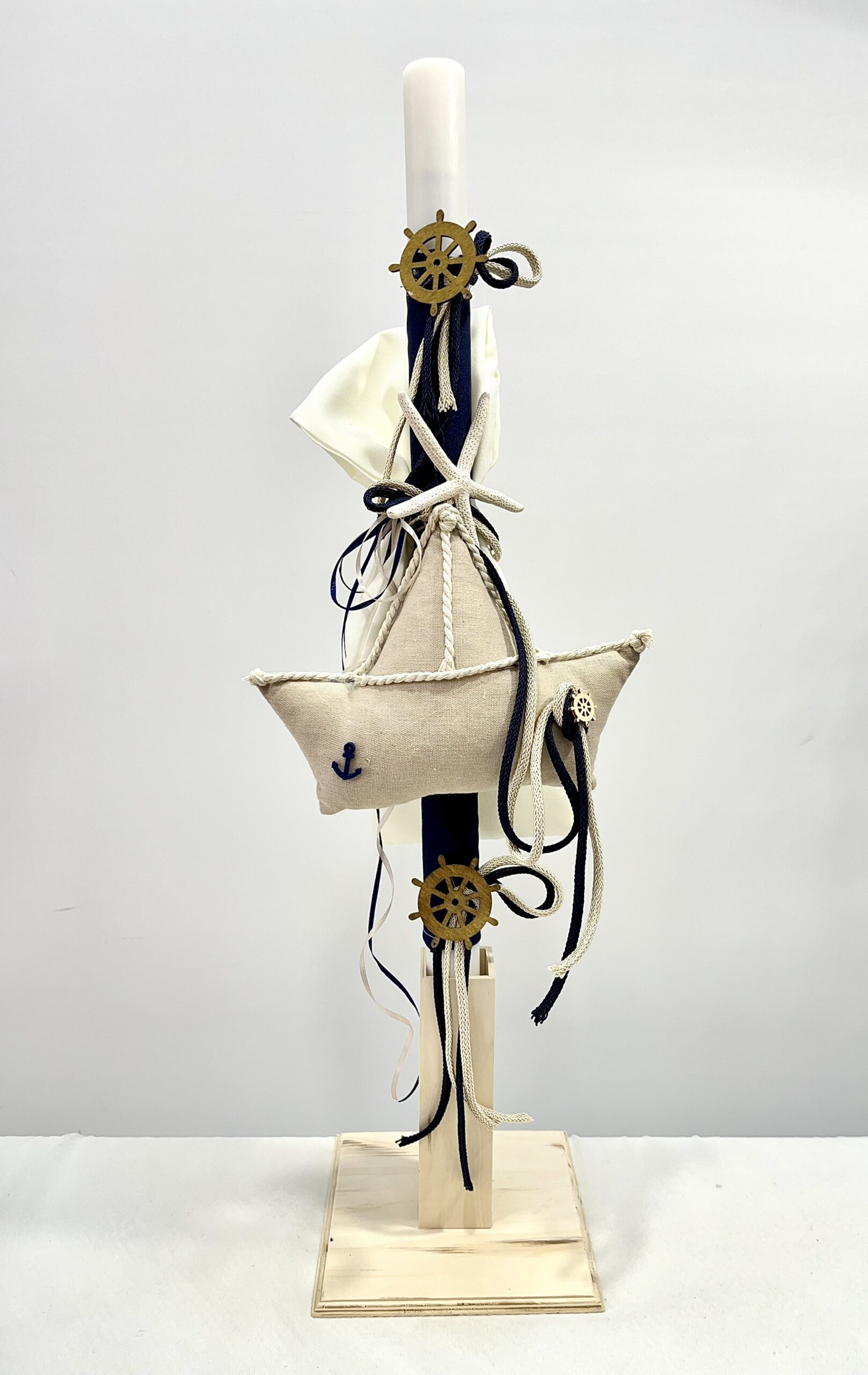 Χειροποίητη λαμπάδα και μπρανς για αγόρι, με θέμα καραάβι. Με εκρού πανί, λευκό και μπλε καραβόσχοινο, διακοσμητικό αστερία, αγκυρούλα και τιμονάκια.
