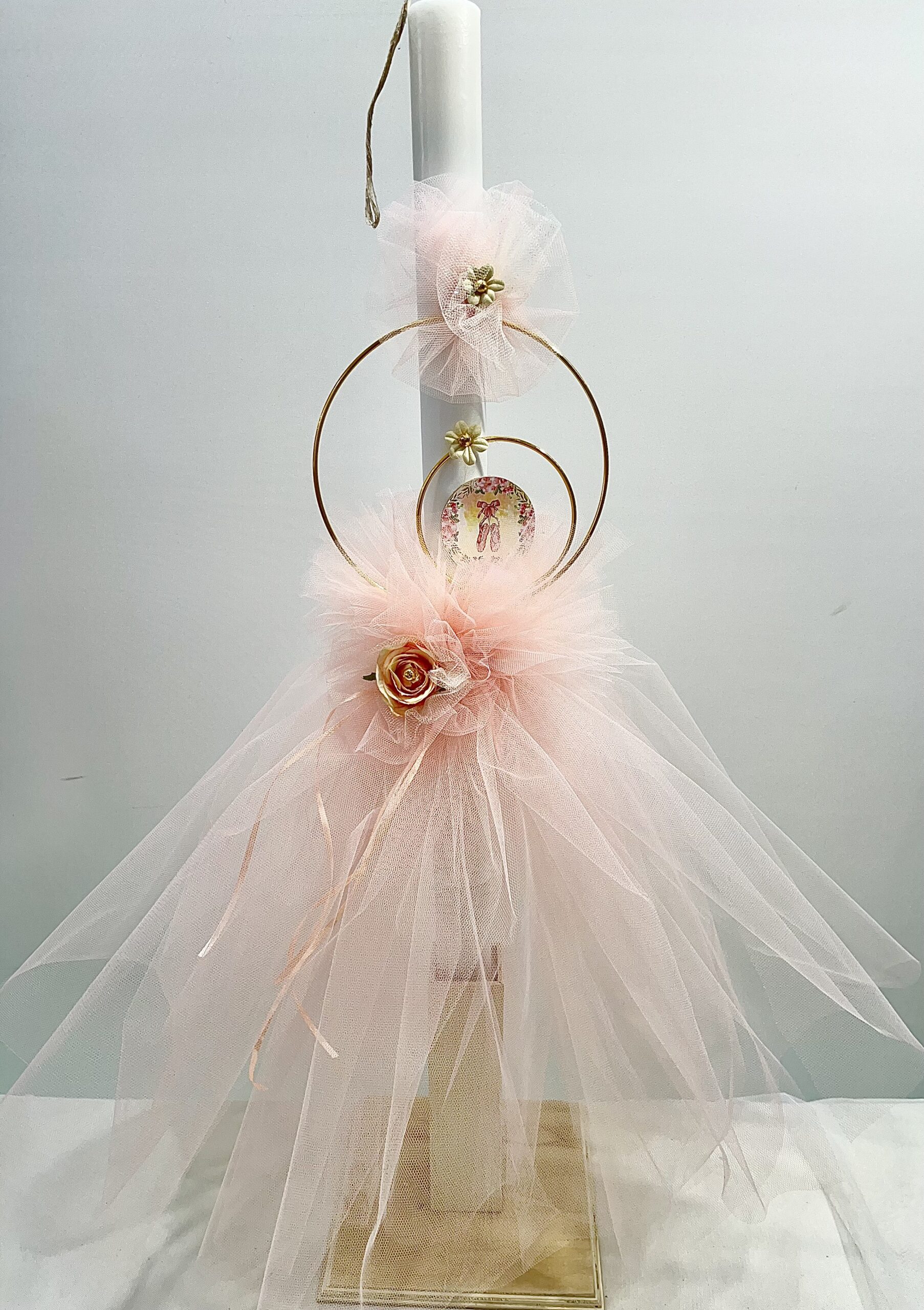 Χειροποίητη λαμπάδα και μπρανς για κορίτσι με θέμα πουέντ. Με κοραλί τούλι, σομόν κορδέλα και διακοσμητικό λουλούδι.