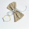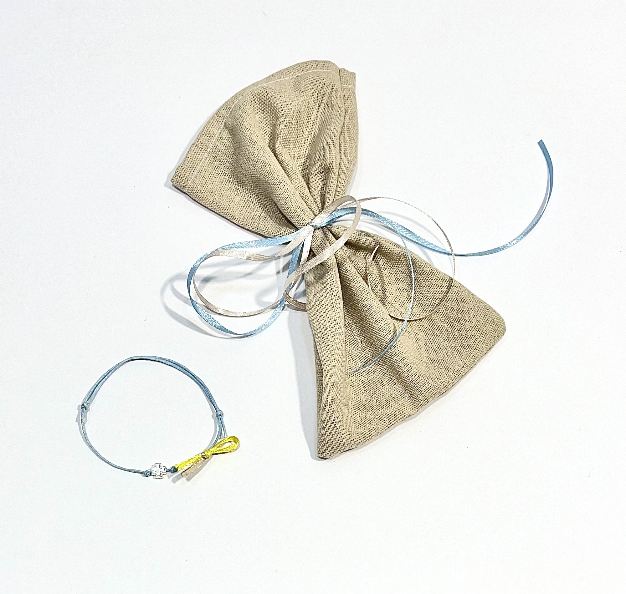 Χειροποίητα μαρτυρικά με γαλάζιο σχοινί, ασημί σταυρό και κίτρινο με εκρού φιόγκο, 50 τεμάχια.