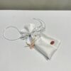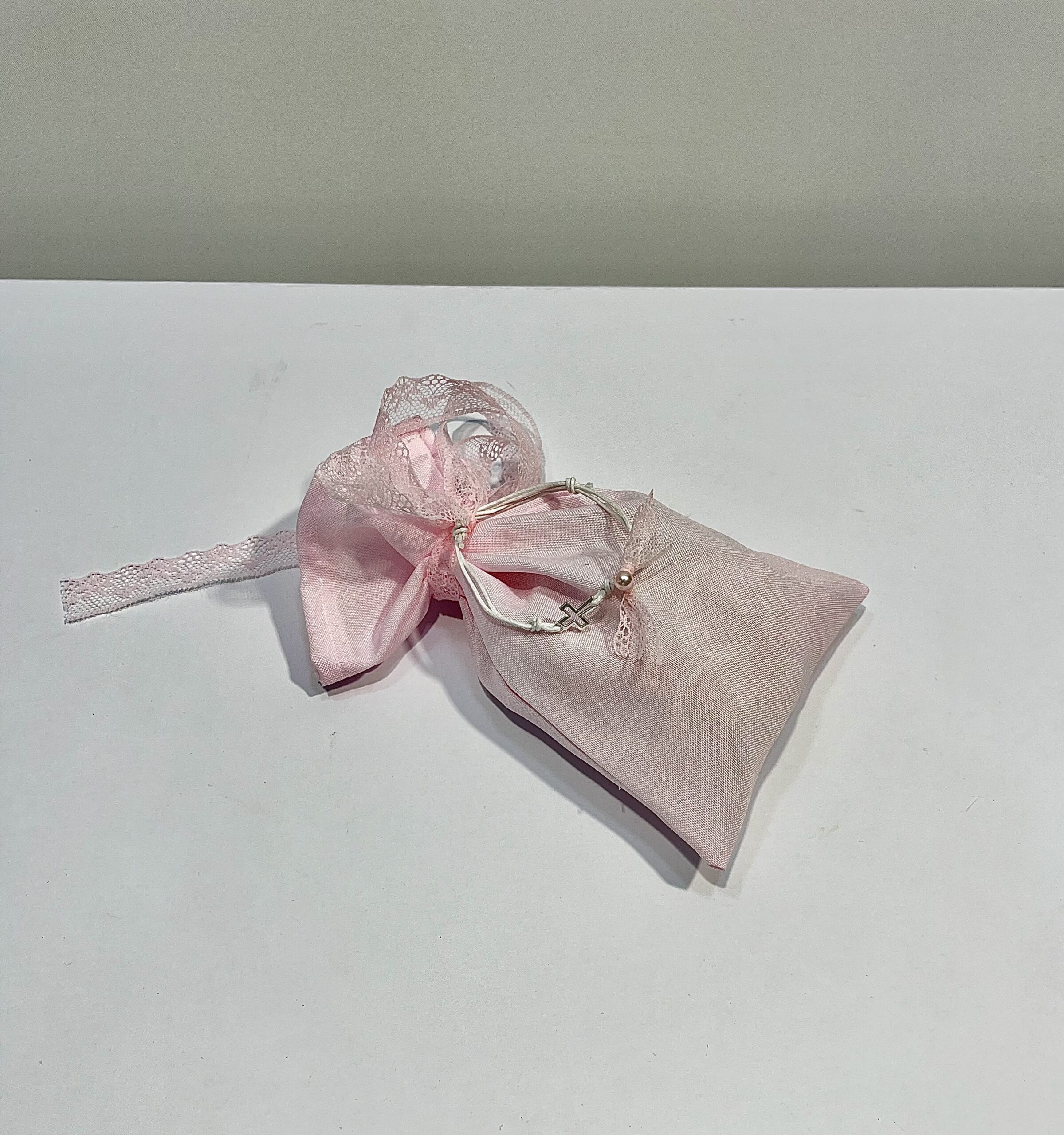 Χειροποίητα μαρτυρικά με λευκό σχοινί, ασημί σταυρό, ροζ μπίλια και φιόγκο από ροζ δαντέλα, 50 τεμάχια.