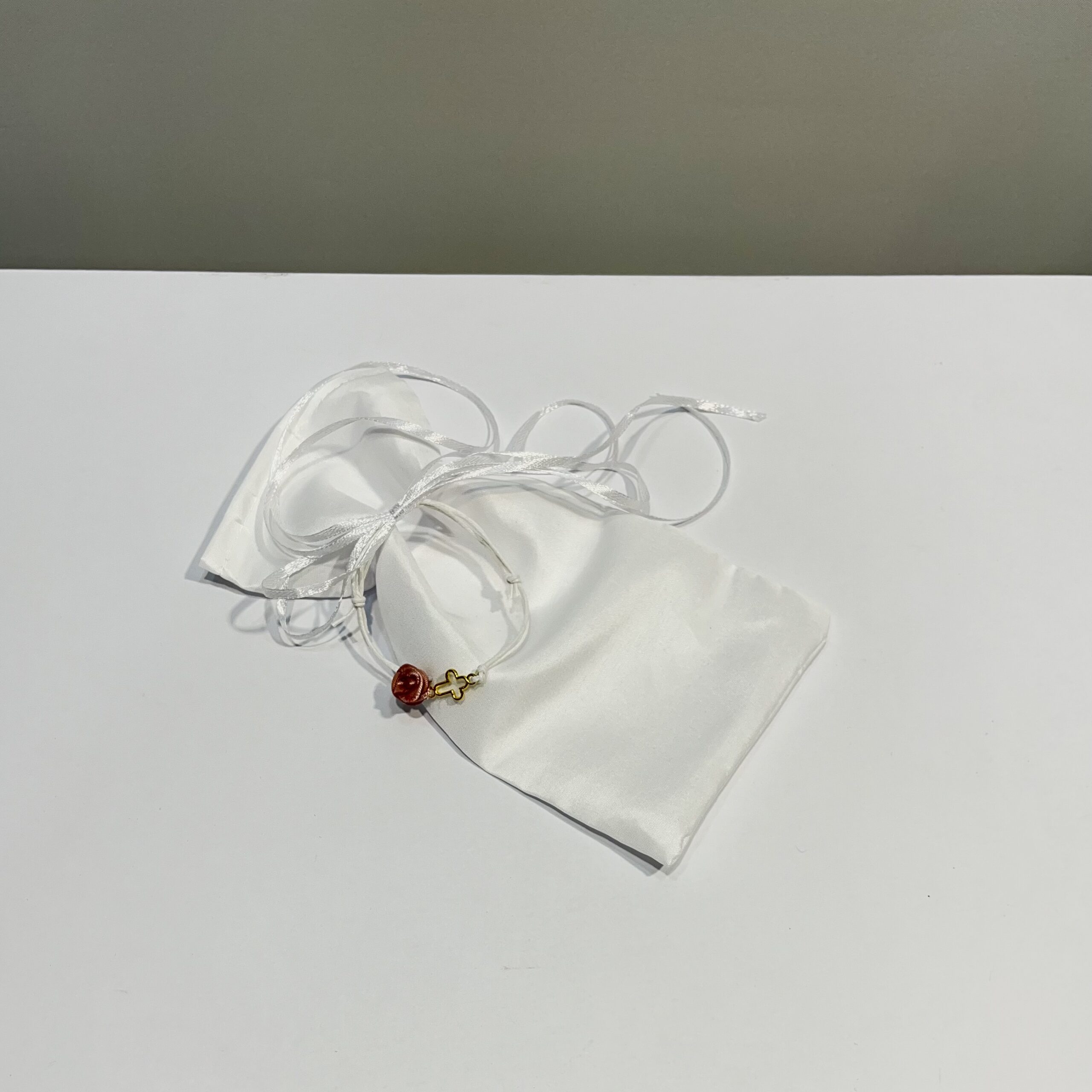 Χειροποίητα μαρτυρικά με λευκό σχοινί, χρυσό τρυπητό σταυρό και διακοσμητικό τριανταφυλλάκι, 50 τεμάχια.