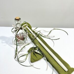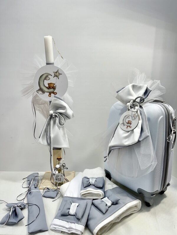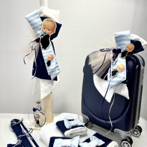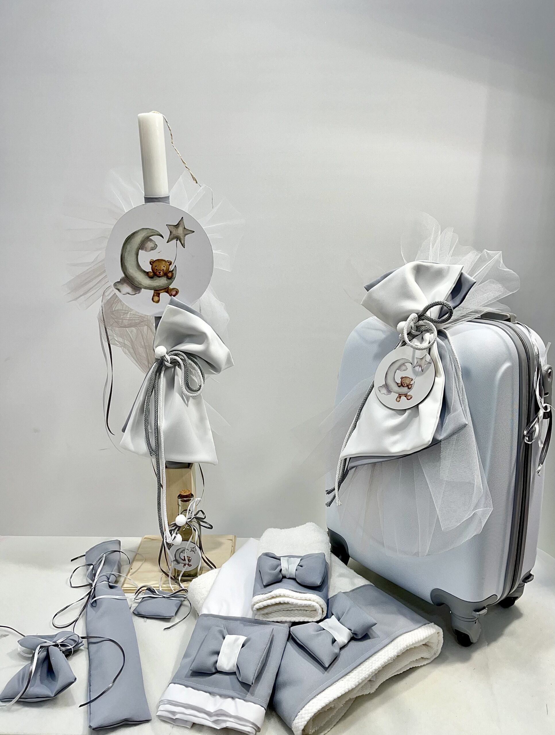 Χειροποίητο πακέτο βάπτισης για αγόρι με θέμα αρκουδάκι. Το πακέτο περιλαμβάνει τη βαλίτσα, τη λαμπάδα, τα λαδόπανα, το λαδοσέτ και 50 μαρτυρικά.